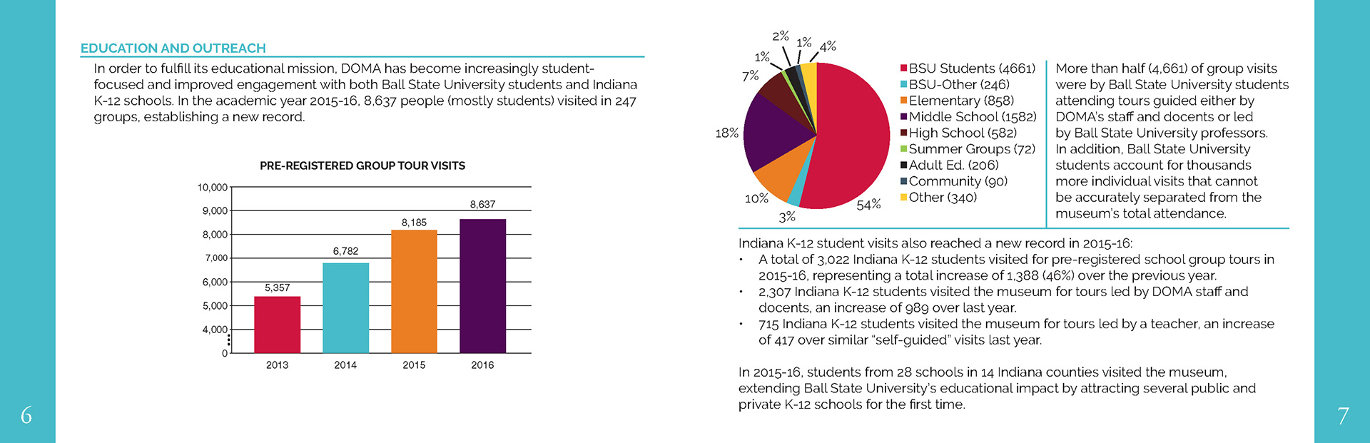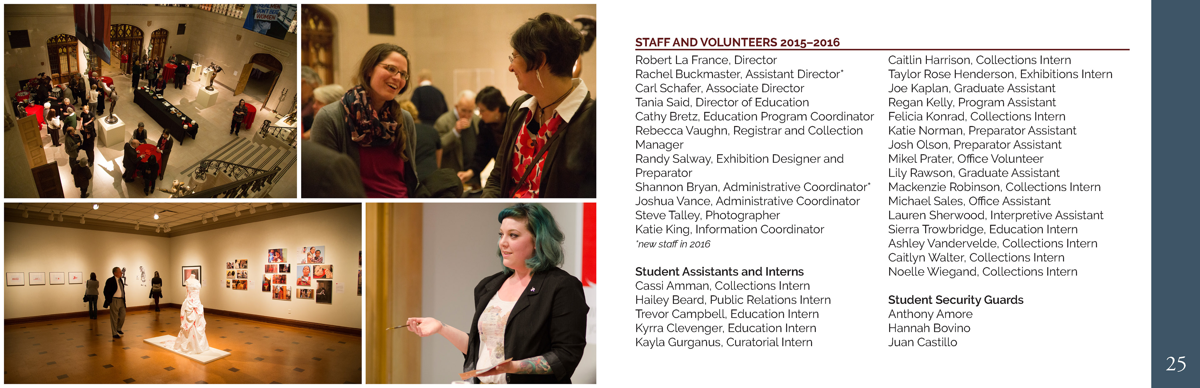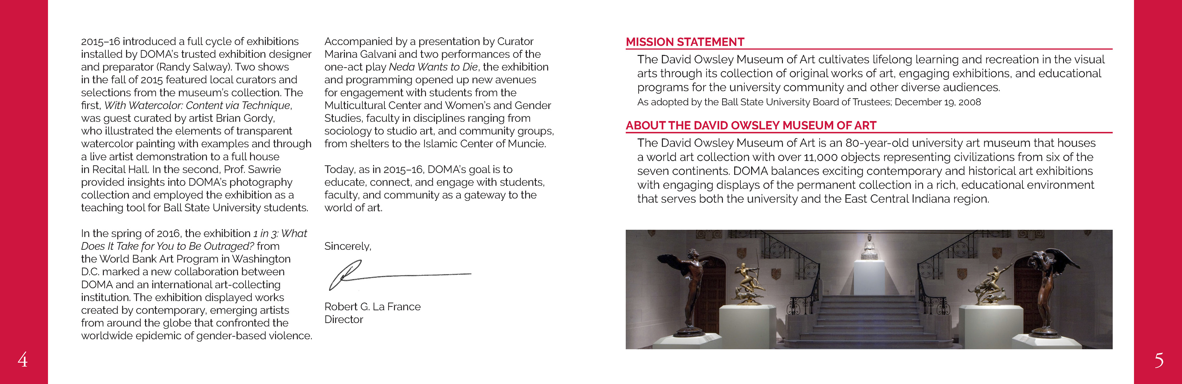 The David Owsley Museum of Art at BSU requested their first designed Annual Report. For the full PDF of the 2015-2016 report, visit their website at: bsu.edu/artmuseum